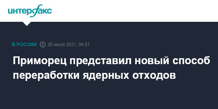 Москва. 30 июля. INTERFAX.RU - Инновационный подход к переработке ядерных отходов предложил на федеральном конкурсе " Моя страна - моя Россия" житель Приморья Михаил Гурин, сообщает в пятницу пресс-служба регионального правительства.