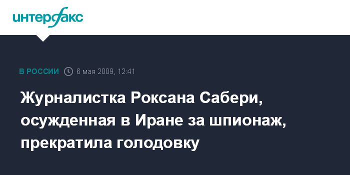 Москва. 6 мая. INTERFAX.RU - Журналистка Роксана Сабери, в апреле осужденная судом Ирана на восемь лет тюремного заключения за шпионаж в пользу США, прекратила голодовку, сообщает в среду британская телерадиокорпорация Би-би-си со ссылкой на заявление отца журналистки Резу Сабери.