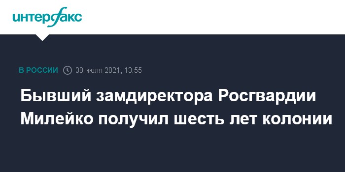 Москва. 30 июля. INTERFAX.RU - Реутовский гарнизонный военный суд приговорил к шести годам колонии общего режима бывшего замдиректора Росгвардии Сергея Милейко по уголовному делу о мошенничестве, передает корреспондент "Интерфакса".