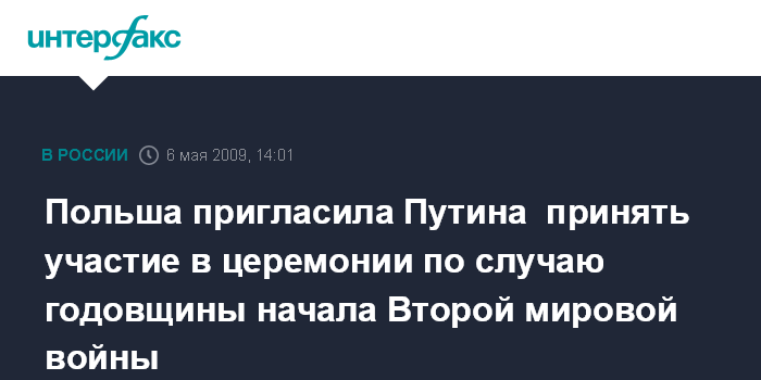 Москва. 6 мая. INTERFAX.RU - Премьер-министр Польши Дональд Туск пригласил премьер-министра РФ Владимира Путина посетить с визитом Польшу и принять участие 1 сентября в мероприятиях по случаю годовщины начала Второй мировой войны, сообщил в среду на пресс-конференции в Москве глава МИД РФ Сергей Лавров.