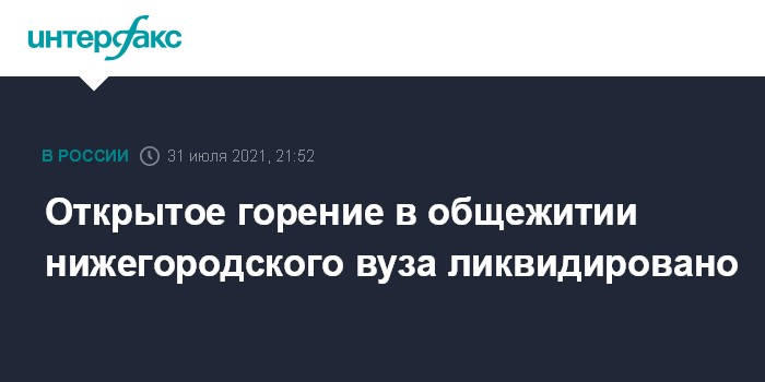 Москва. 31 июля. INTERFAX.RU - Пожарные подразделения ликвидировали открытое горение в общежитии Приволжского медицинского университета (ПИМУ) в Нижнем Новгороде.