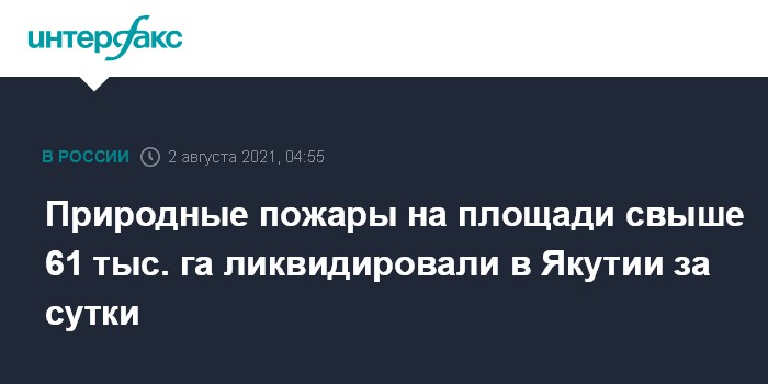 Ранее сообщалось, что на территории Якутии введен режим ЧС регионального характера из-за лесных пожаров. Горит более 1,3 млн га леса. В 2020 году площадь лесных пожаров в Якутии составила около 5 млн га. По словам министра природных ресурсов и экологии РФ Александра Козлова, в прошлом году 70% от общей территории, пройденной в России пожарами, пришлось на Якутию.