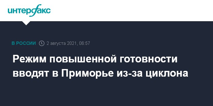 Москва. 2 августа. INTERFAX.RU - Режим повышенной готовности введут в Приморском крае из-за угрозы прохождения мощного циклона, сообщил в понедельник губернатор региона Олег Кожемяко.