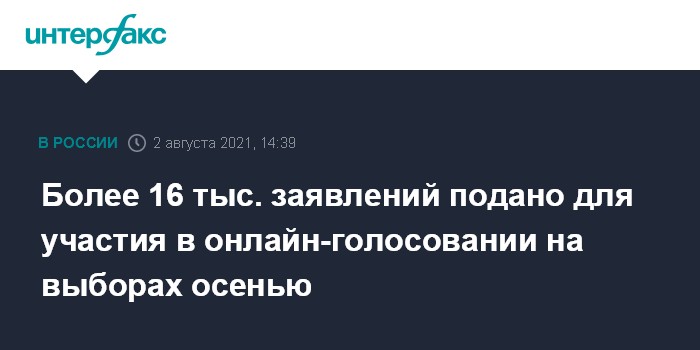 Москва. 2 августа. INTERFAX.RU - Российские избиратели подали свыше 16 тыс. заявлений для участия в дистанционном электронном голосовании (ДЭГ) на предстоящих выборах в сентябре, сообщила глава ЦИК РФ Элла Памфилова.
