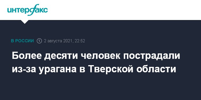Москва. 2 августа. INTERFAX.RU - В Тверской области в результате сильного ураганного ветра пострадали 11 человек, сообщила в понедельник пресс-служба МЧС России.