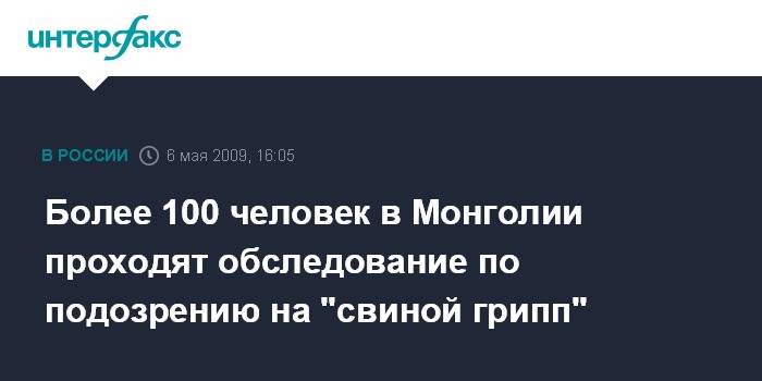 Москва. 6 мая. INTERFAX.RU - В столице Монголии сняты с рейса авикомпании "Аэрофлот" Москва-Улан-Батор и госпитализированы 117 человек, которые проверяются на заражение вирусом A/H1N1, известным также как "свиной грипп", сообщает в среду монгольская телерадиокомпания "Аист".