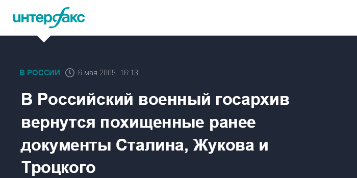 В Российский военный госархив вернутся похищенные ранее документы Сталина, Жукова и Троцкого