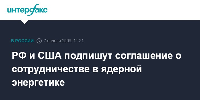 Сочи. 7 апреля. INTERFAX.RU - Россия и США в ближайшее время подпишут соглашение о сотрудничестве в мирном использовании ядерной энергии, которое позволит компаниям двух стран осуществлять передачу ядерных материалов, реакторов и основных реакторных компонентов.