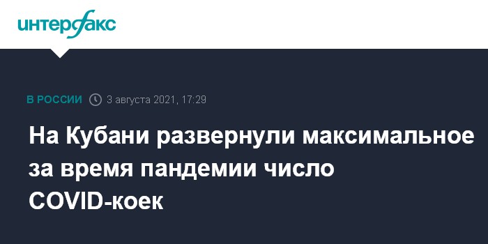 Москва. 3 августа. INTERFAX.RU - Краснодарский край развернул максимальное количество коек для больных с коронавирусной инфекцией - более 7 тысяч, сообщил во вторник региональный оперативный штаб.