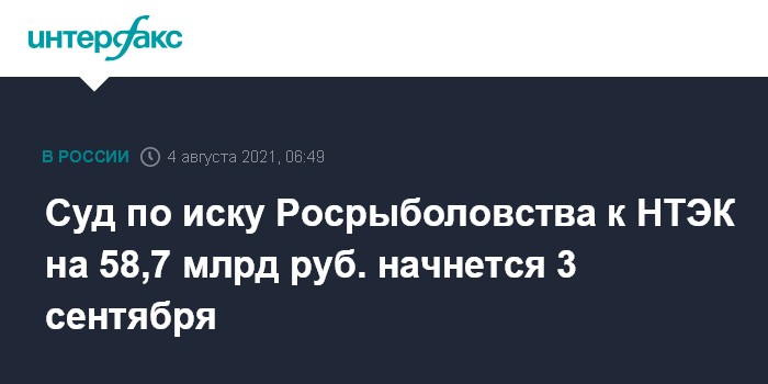 Суд по иску Росрыболовства к НТЭК на 58,7 млрд руб. начнется 3 сентября