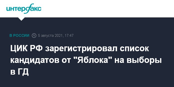 Москва. 5 августа. INTERFAX.RU - Центризбирком России зарегистрировал федеральный список кандидатов партии "Яблоко" для участия в предстоящих выборах в Госдуму.