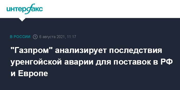 Москва. 6 августа. INTERFAX.RU - "Газпром" в настоящее время анализирует последствия аварии на ГПЗ в Уренгое для поставок газа в России и Европе.