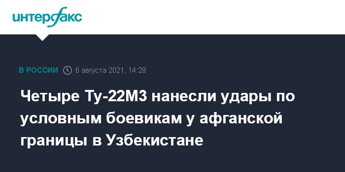 Москва. 6 августа. INTERFAX.RU - Четыре дальних бомбардировщика Ту-22М3 совершили перелет из России в Узбекистан, нанесли бомбовые удары по лагерям условных боевиков в ходе учения военных РФ и Узбекистана вблизи афганской границы, сообщили в Минобороны РФ в пятницу.