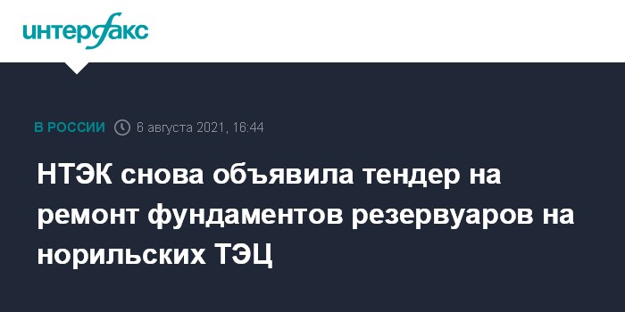 Москва. 6 августа. INTERFAX.RU - АО "Норильско-Таймырская энергетическая компания" (НТЭК, входит в ГМК "Норильский никель") повторно объявило тендер на обустройство фундаментов под резервуар №1 Норильской ТЭЦ-1 и резервуар №3 Норильской ТЭЦ-2, сообщается на сайте госзакупок.