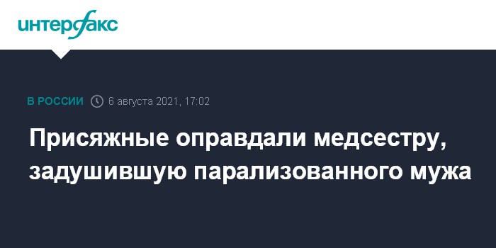 Москва. 6 августа. INTERFAX.RU - В Белгородском областном суде присяжные единодушно оправдали 59-летнюю медсестру по делу об убийстве парализованного мужа, сообщила пресс-служба суда. Они не нашли в ее действиях состава преступления.