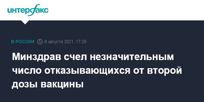 Москва. 6 августа. INTERFAX.RU - Большинство россиян стараются получить обе дозы вакцины от коронавируса, доля тех, кто не приходит для получения второй дозы вакцины крайне незначительна. Об этом заявил первый замминистра здравоохранения РФ Виктор Фисенко.