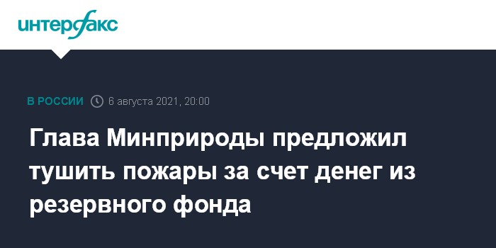 Москва. 6 августа. INTERFAX.RU - Министерство природных ресурсов предлагает использовать средства из резервного фонда правительства России для тушения лесных пожаров во время аномальной жары. Об этом глава ведомства Александр Козлов сообщил на совещании у президента о ситуации с паводками и пожарами.