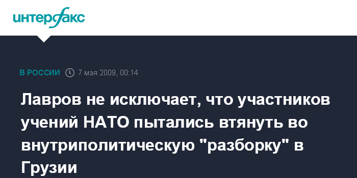 "Думаю, что это очередная провокация, и убежден, что абсолютно не случайно эта провокация затеяна как раз накануне начинающихся 6 мая, несмотря на все наши предостережения, учений НАТО на территории Грузии", - сказал С.Лавров в интервью телеканалу "Евроньюс".