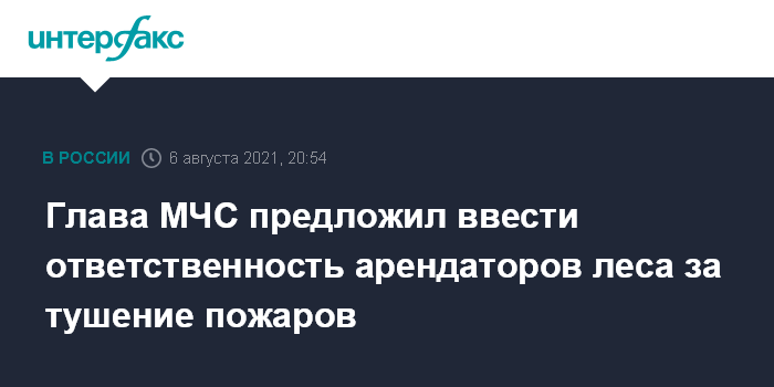 "На наш взгляд, в целях стабилизации ситуации с природными пожарами необходимо вернуть обязанность арендаторов по тушению природных пожаров на арендуемых лесных участках, как это было до 1997 года, и прилегающих к ним территориях - 5 км от границы арендованного участка; установить ответственность за непринятие мер и нарушение конкретного предельного срока по локализации и ликвидации лесного пожара, а также выход его за границы арендуемого участка", - сказал министр.