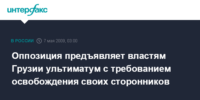 Тбилиси. 7 мая. ИНТЕРФАКС - Представители оппозиции потребовали от властей Грузии до утра освободить троих задержанных участников оппозиционных манифестаций, угрожая в противном случае принять меры для их освобождения.