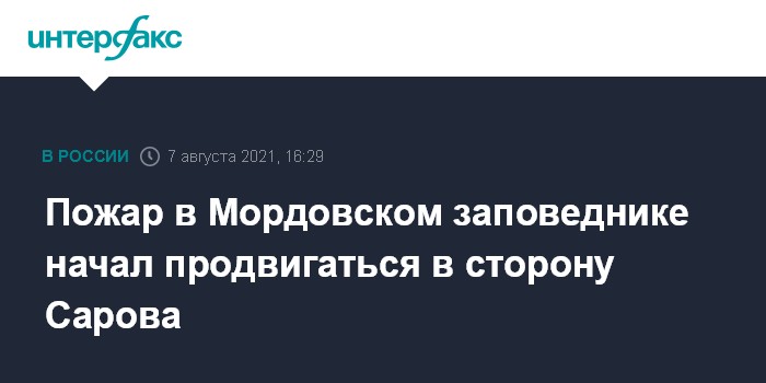 Москва. 7 августа. INTERFAX.RU - Огонь пожара в Мордовском заповеднике движется в сторону Сарова, сообщил "Интерфаксу" глава Темниковского муниципального района республики Мордовия Сергей Кизим.