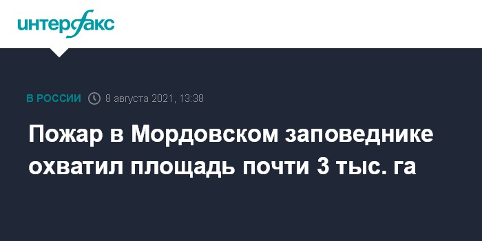 Москва. 8 августа. INTERFAX.RU - Площадь пожара в Мордовском природном заповеднике увеличилась почти до 3 000 га, сообщает Единая диспетчерская служба Темниковского района Мордовии.