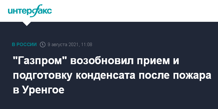 Москва. 9 августа. INTERFAX.RU - "Газпром" постепенно возобновляет работу производственной цепочки системы приема и подготовки конденсата после пожара в четверг на заводе по подготовке конденсата к транспорту в ЯНАО.