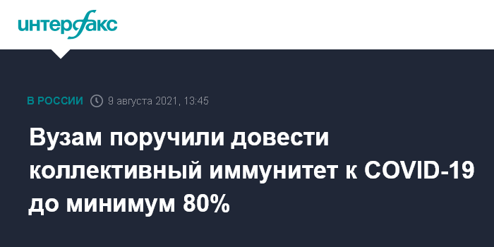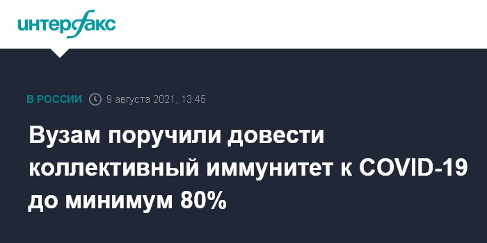 В изданных Минобрнауки рекомендациях нет указания, к какой точно дате вузы должны обеспечить коллективный иммунитет на уровне 80%, но в ранее изданных документах ведомство рекомендовало сотрудникам всех своих организаций пройти вакцинацию от коронавируса до 25 августа.