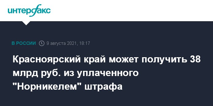 Красноярский край может получить 38 млрд руб. из уплаченного "Норникелем" штрафа