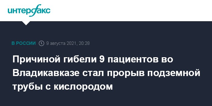 Москва. 9 августа. INTERFAX.RU - Порыв кислородной трубы, которая проходит под землей, привел к прекращению подачи кислорода в республиканской клинической больнице скорой помощи во Владикавказе, из-за чего погибли девять человек, сообщил врио главы Северной Осетии Сергей Меняйло.