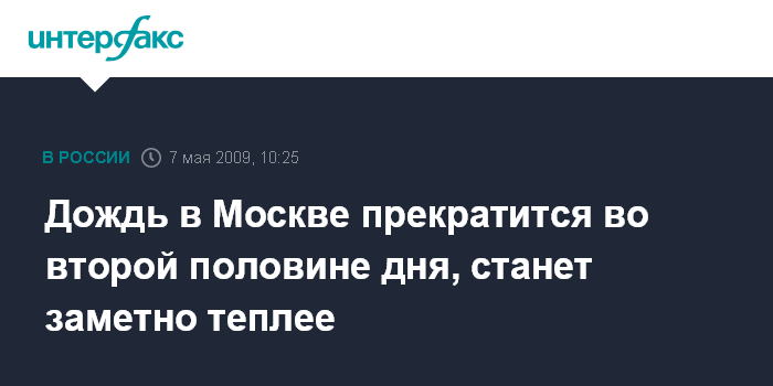 Москва. 7 мая. INTERFAX.RU - Начавшийся утром в четверг в столице моросящий дождь прекратится лишь во второй половине дня, сообщили "Интерфаксу" в Гидрометеобюро Москвы и Московской области. "В первой половине дня воздух в городе прогреется до 11-13 градусов, а во второй - до 16-18", - сказал собеседник агентства. Он подчеркнул, что ближайшей ночью в Москве не ожидается существенных осадков.