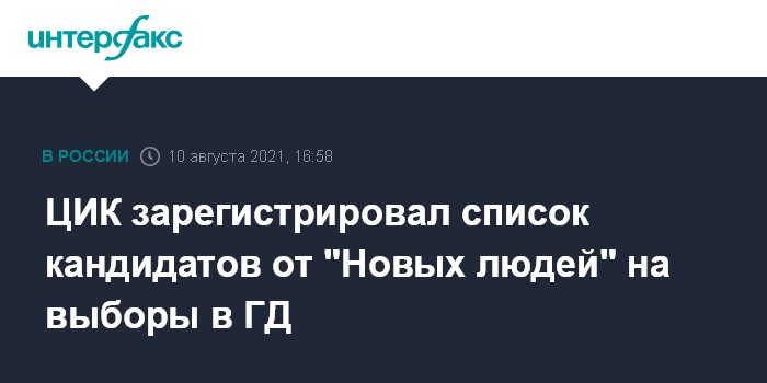 Москва. 10 августа. INTERFAX.RU - Центризбирком России во вторник зарегистрировал федеральный список кандидатов партии "Новые люди" для участия в предстоящих выборах в Госдуму.