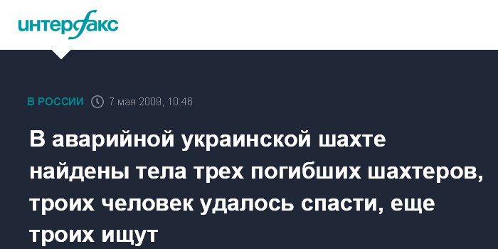 Москва. 7 мая. INTERFAX.RU - В аварийной украинской шахте "Новодзержинская" утром в четверг спасены три горняка, найдены двое погибших. Таким образом, число жертв трагедии возросло до трех человек.