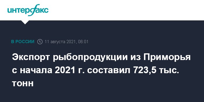 По данным на 8 августа 2021 года из Приморья в Республику Корея поставлено 484,2 тыс. тонн рыбы и морепродуктов. В КНР экспортировано 160,1 тыс. тонн, в Японию - 15,6 тыс. тонн. Также Россельхознадзором оформлены ветеринарные сертификаты на экспортные партии рыбопродукции общим весом 331 тыс. тонн для отправки в страны Западной и Центральной Африки. В Германию направлено 5,7 тыс. тонн рыбопродукции из Приморья, во Францию и во Вьетнам - по 1,2 тыс. тонн.
