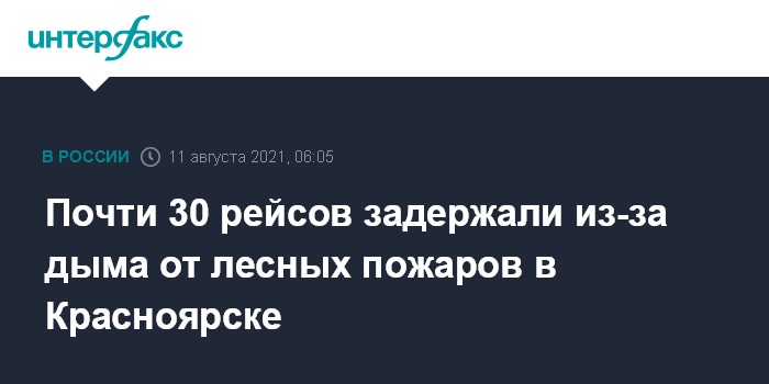 Москва. 11 августа. INTERFAX.RU - Дым от лесных пожаров стал причиной задержки, по меньшей мере, 27-ми рейсов в/из Международного аэропорта Красноярска ("Емельяново") в среду, следует из данных онлайн-табло авиагавани.