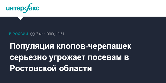 Москва. 7 мая. INTERFAX.RU - Серьезную угрозу для посевов озимой пшеницы и ячменя в Ростовской области в этом году будет представлять клоп-черепашка, получивший свое название из-за внешнего сходства с панцирем черепах.