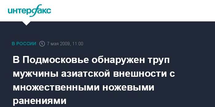 Москва. 7 мая. INTERFAX.RU - В Балашихинском районе Московской области в среду днем был обнаружен привязанный к дереву труп мужчины азиатской внешности с множественными ножевыми ранениями, сообщил "Интерфаксу" в четверг источник в правоохранительных органах региона.