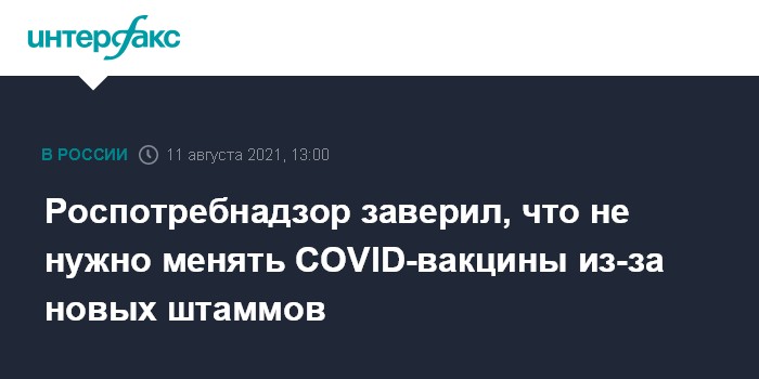 Москва. 11 августа. INTERFAX.RU - Существующие вакцины от коронавируса эффективны против мутаций вируса, необходимости менять их состав в настоящий момент нет, заявила заместитель директора по клинико-аналитической работе ЦНИИ эпидемиологии Роспотребнадзора Наталья Пшеничная.