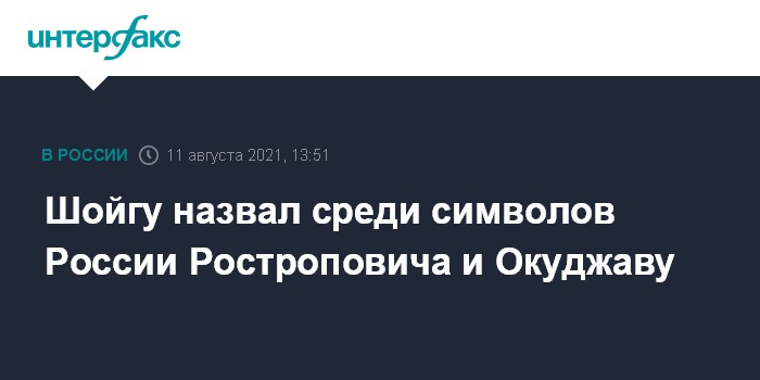 Москва. 11 августа. INTERFAX.RU - Министр обороны РФ Сергей Шойгу назвал музыканта Мстислава Ростроповича, поэтов Евгения Евтушенко и Булата Окуджаву среди национальных символов России, которые необходимо защищать.