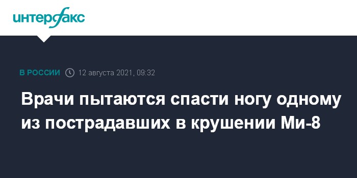 Москва. 12 августа. INTERFAX.RU - В краевую больницу Петропавловска-Камчатского доставили четырех человек, выживших после падения Ми-8 в Курильское озеро, одного из них оперируют, пытаясь спасти ногу после перелома, сообщил главврач больницы Андрей Кисляков через пресс-службу правительства края.