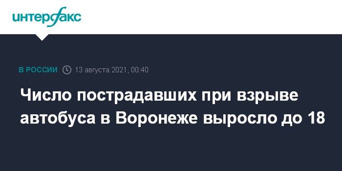 Москва. 13 августа. INTERFAX.RU - Количество пострадавших при взрыве пассажирского автобуса в Воронеже возросло до 18, сообщил губернатор Александр Гусев.