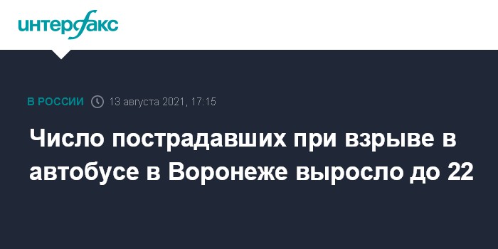 Москва. 13 августа. INTERFAX.RU - Число пострадавших при взрыве в автобусе в центре Воронежа возросло до 22 человек, из них двое скончались.