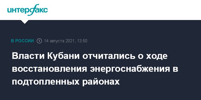 Москва. 14 августа. INTERFAX.RU - Энергоснабжение на подтопленных территориях Краснодарского края восстанавливают 92 бригады энергетиков, сообщил региональный оперативный штаб.