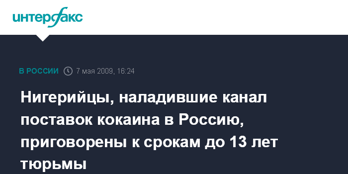 Как сообщила "Интерфаксу" в четверг руководитель пресс-службы Мосгорсуда Анна Усачева, гражданин Нигерии Чуквуемек Кристофер Аманамбу приговорен к 13 годам строго режима за приготовление к сбыту 5 кг кокаина. Россиянка Анна Алехина, признанная виновной по этому же эпизоду, получила 8,5 лет общего режима.