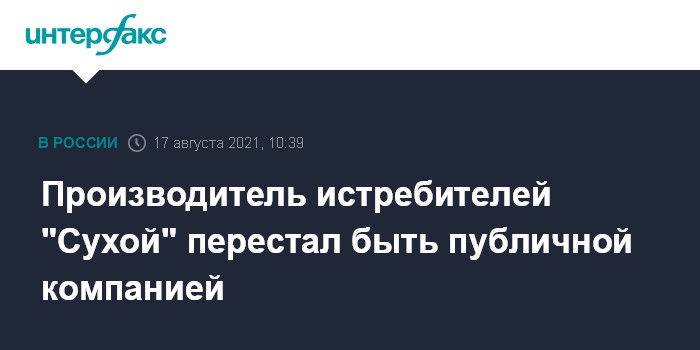 Москва. 17 августа. INTERFAX.RU - "Сухой", разработчик и производитель истребителей марки "Су", отказался от статуса публичной компании, сообщила через пресс-службу заместитель управляющего директора компании по правовым и имущественным вопросам Яна Крючкова.