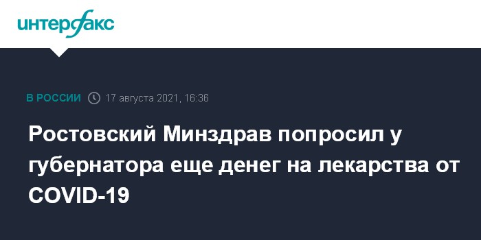 Москва. 17 августа. INTERFAX.RU - Глава Минздрава Ростовской области Юрий Кобзев попросил губернатора Василия Голубева выделить больше денег на закупку лекарств пациентам с COVID-19 из-за их возможного дефицита в начале сентября. Министр сказал об этом на заседании оперштаба 17 августа.