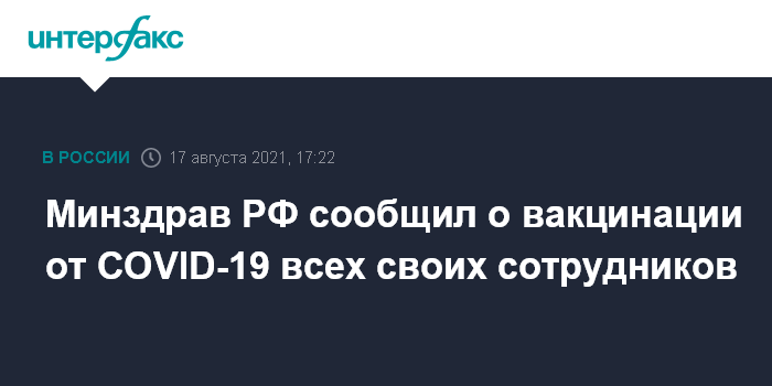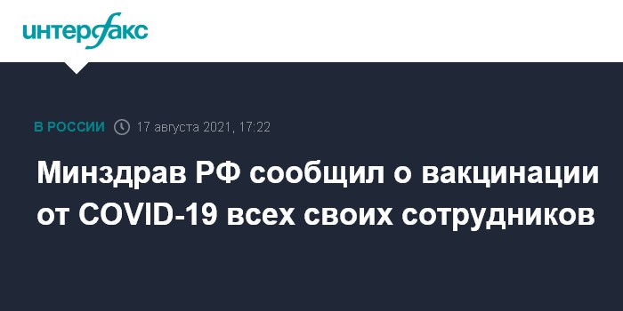 Москва. 17 августа. INTERFAX.RU - Все сотрудники Минздрава РФ, не имеющие медицинских противопоказаний, привиты от новой коронавирусной инфекции, сообщил во вторник "Интерфаксу" помощник министра здравоохранения Алексей Кузнецов.