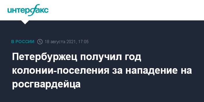 Москва. 18 августа. INTERFAX.RU - В Петербурге Ленинский суд отправил на год в колонию-поселение Ивана Пунегова, которого признал виновным в применении насилия к сотруднику Росгвардии (ч.1 ст.318 УК), сообщила пресс-служба городских судов.