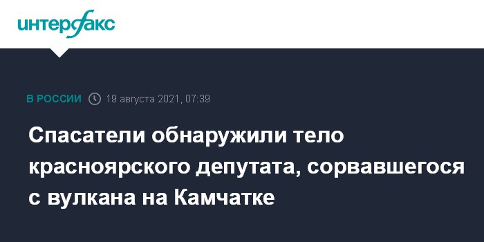 Москва. 19 августа. INTERFAX.RU - Тело депутата горсовета Железногорска Красноярского края Андрея Закалина, сорвавшегося с Ключевского вулкана на Камчатке, обнаружено, сообщает пресс-служба главного управления МЧС по Камчатском краю.