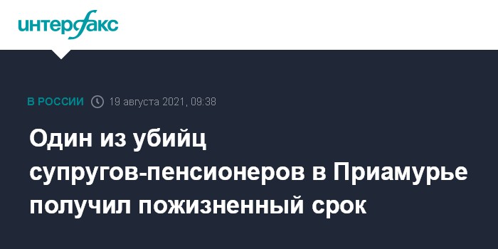 Москва. 19 августа. INTERFAX.RU - Двум жителям Амурской области вынесен приговор за убийство пожилой супружеской пары, а также хищение у них государственных медалей и денег. Один из них получил пожизненный срок, а второй – 20 лет колонии строгого режима.